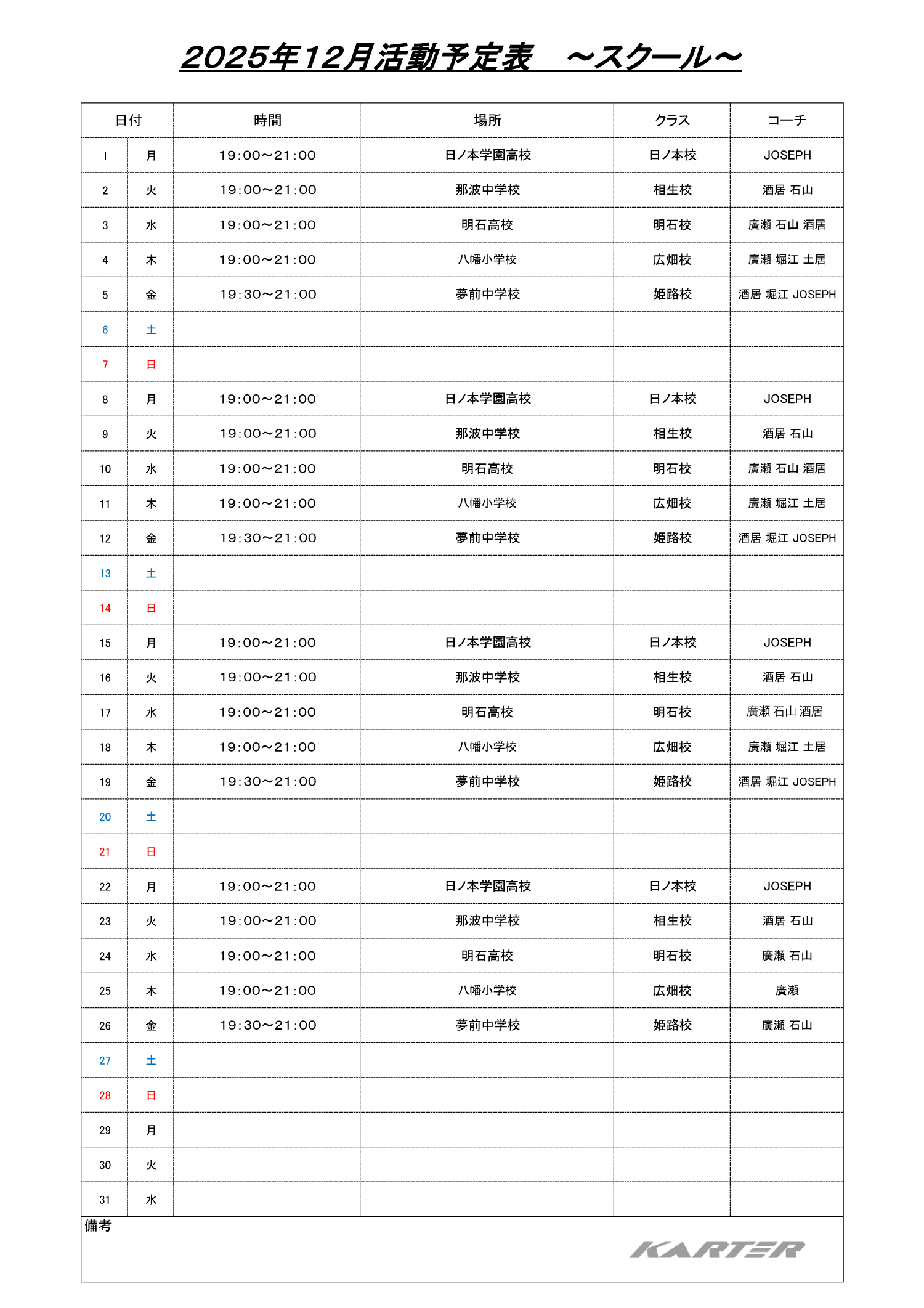 カテゴリー お知らせ 2025年12月練習予定表 投稿者 作成者: karter 投稿日 2025年11月30日 2025年12月練習予定表 ※PDFファイルはページ下部にあります 【PDF版】 2025年12月練習予定表(スクール) 2025年12月練習予定表(ユースチーム男女) ← 全国大会出場(U15クラブバスケットボールゲームス)に伴う協賛金のお願い